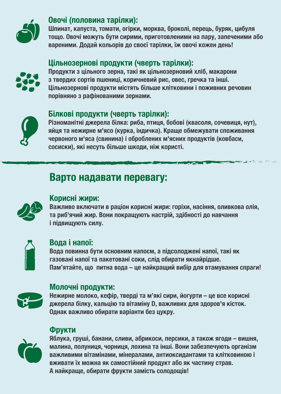 Здорова тарілка допомагає легко контролювати порції і забезпечити різноманітність у раціоні, що робить здорове харчування простим і доступним. Пам’ятайте, що кожен прийом їжі — це можливість зробити здоровий вибір і покращити своє самопочуття.