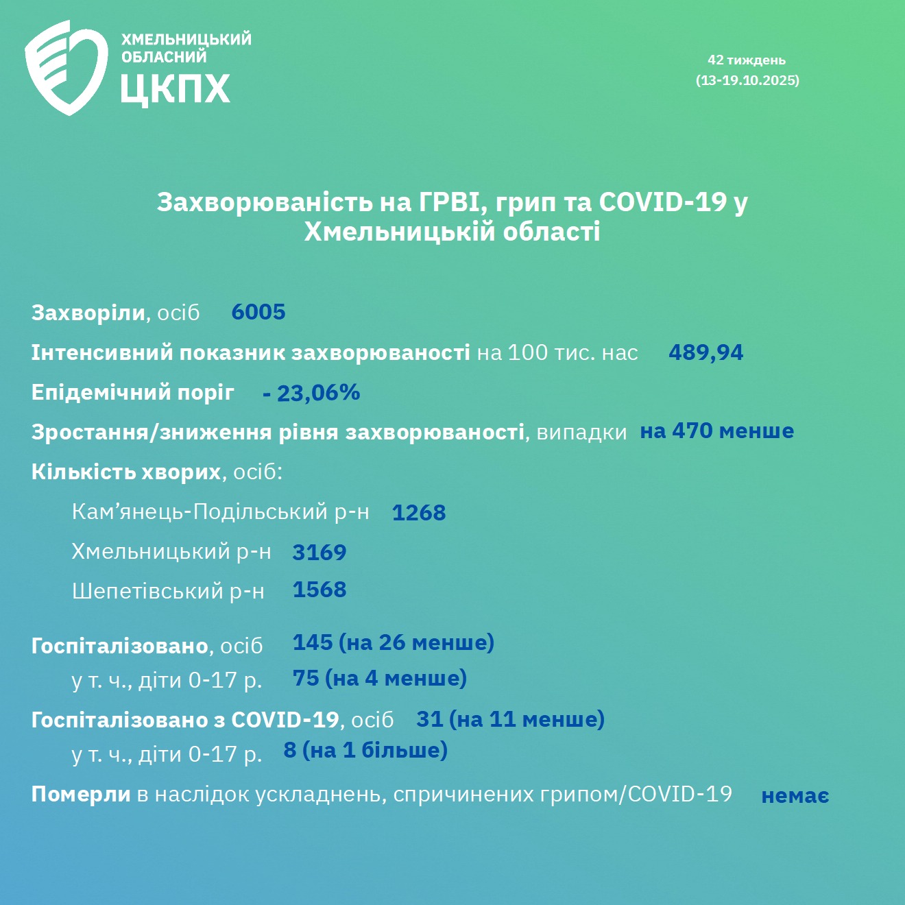 Епідемічна ситуація на ГРВІ, грип та COVID-19 у Хмельницькій області станом на 20.10.2025 р