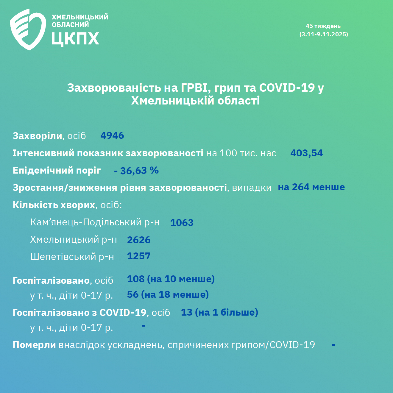 ℹ️ Епідемічна ситуація у Хмельницькій області щодо захворюваності на ГРВІ, грип та COVID-19 станом на 10 листопада 2025 року