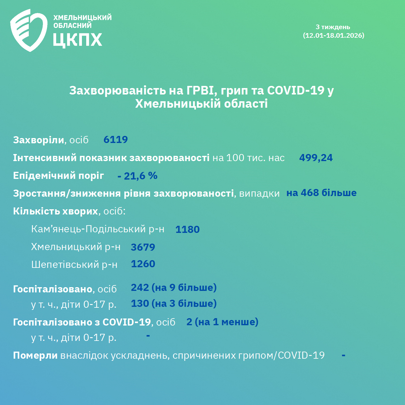 Епідемічна ситуація у Хмельницькій області щодо захворюваності на ГРВІ, грип та COVID-19 станом на 19 січня 2026 року