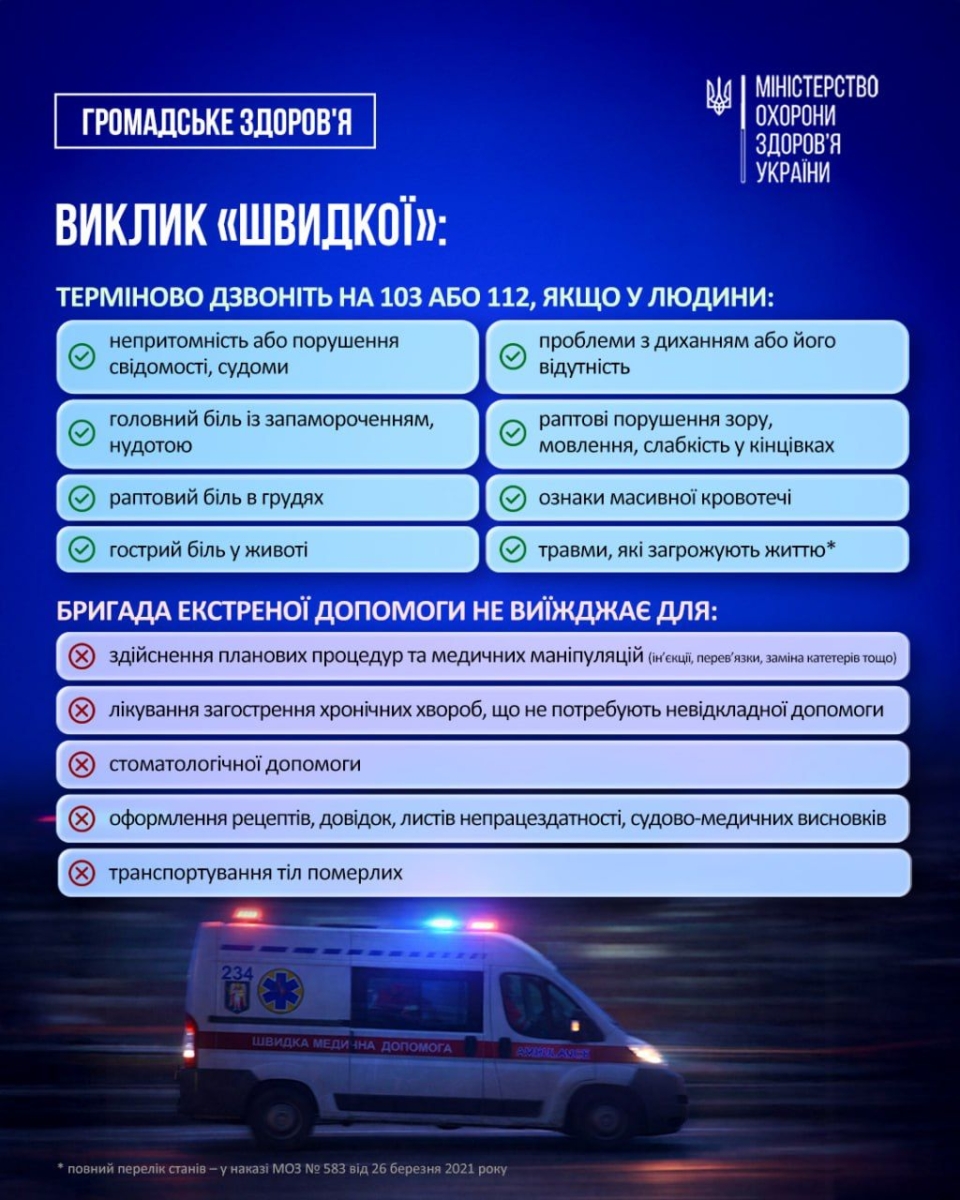 Підстави, за яких бригада екстреної медичної допомоги виїздить на виклик, визначені наказом МОЗ № 583 від 26 березня 2021 року.