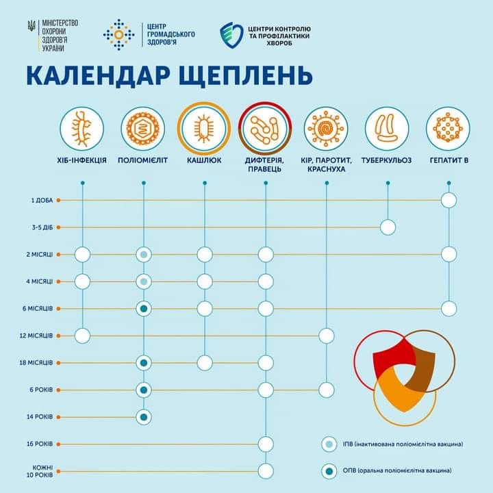Календар містить обов’язкові щеплення проти гепатиту В, туберкульозу, поліомієліту, дифтерії, кашлюку, правця, кору, епідемічного паротиту, краснухи, гемофільної інфекції — і терміни отримання кожної дози.