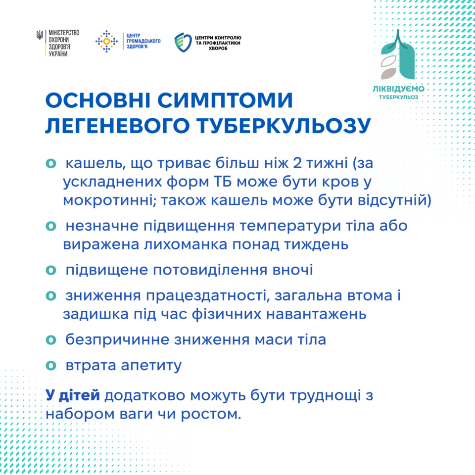 – кашель, що триває більш ніж 2 тижні (за ускладнених форм ТБ може бути кров у мокротинні; також кашель може бути відсутній);