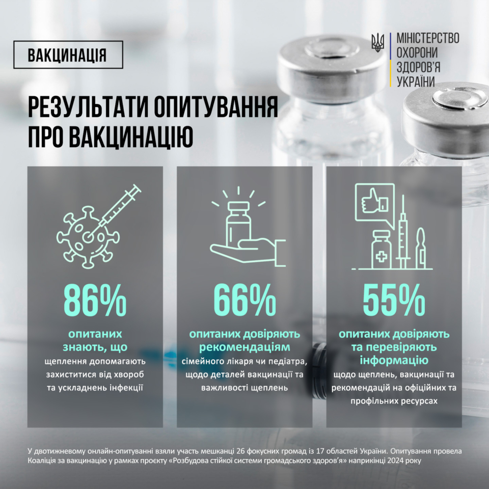 Детальніше про результати можна ознайомитись у матеріалі (https://bit.ly/40B7HB8) на Національний портал з імунізації. Опитування проводила Коаліція за Вакцинацію у рамках проєкту «Розбудова стійкої системи громадського здоров’я» наприкінці 2024 року.