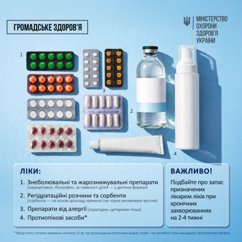 Формуючи домашню аптечку, зважайте на власний стан здоров’я та потреби родини. Якщо хтось із близьких має хронічні захворювання, обов’язково додайте до аптечки препарати, які приймаєте регулярно (рецептурні або безрецептурні). Варто мати щонайменше двотижневий, а краще — місячний запас таких ліків.