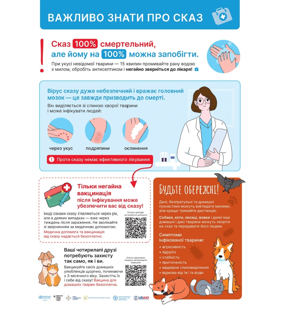 Нагадуємо: укуси хатніх тварин несуть таку ж небезпеку, як і диких. У разі укусу твариною терміново зверніться до лікаря, зробіть щеплення та пройдіть всі призначені обстеження! Це може врятувати ваше життя!