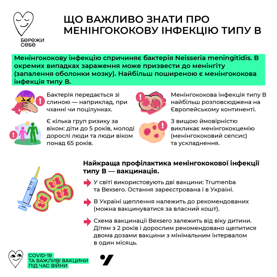Національний календар профілактичних щеплень України передбачає захист від низки інфекційних захворювань. Менінгококова інфекція до цього переліку не входить. Однак, порадившись зі своїм сімейним лікарем, як діти, так і дорослі можуть зробити щеплення проти цієї хвороби. Попередньо, вакцину необхідно придбати в аптеці за власний кошт. Адже найкращим захистом від менінгококової інфекції є вакцинація.