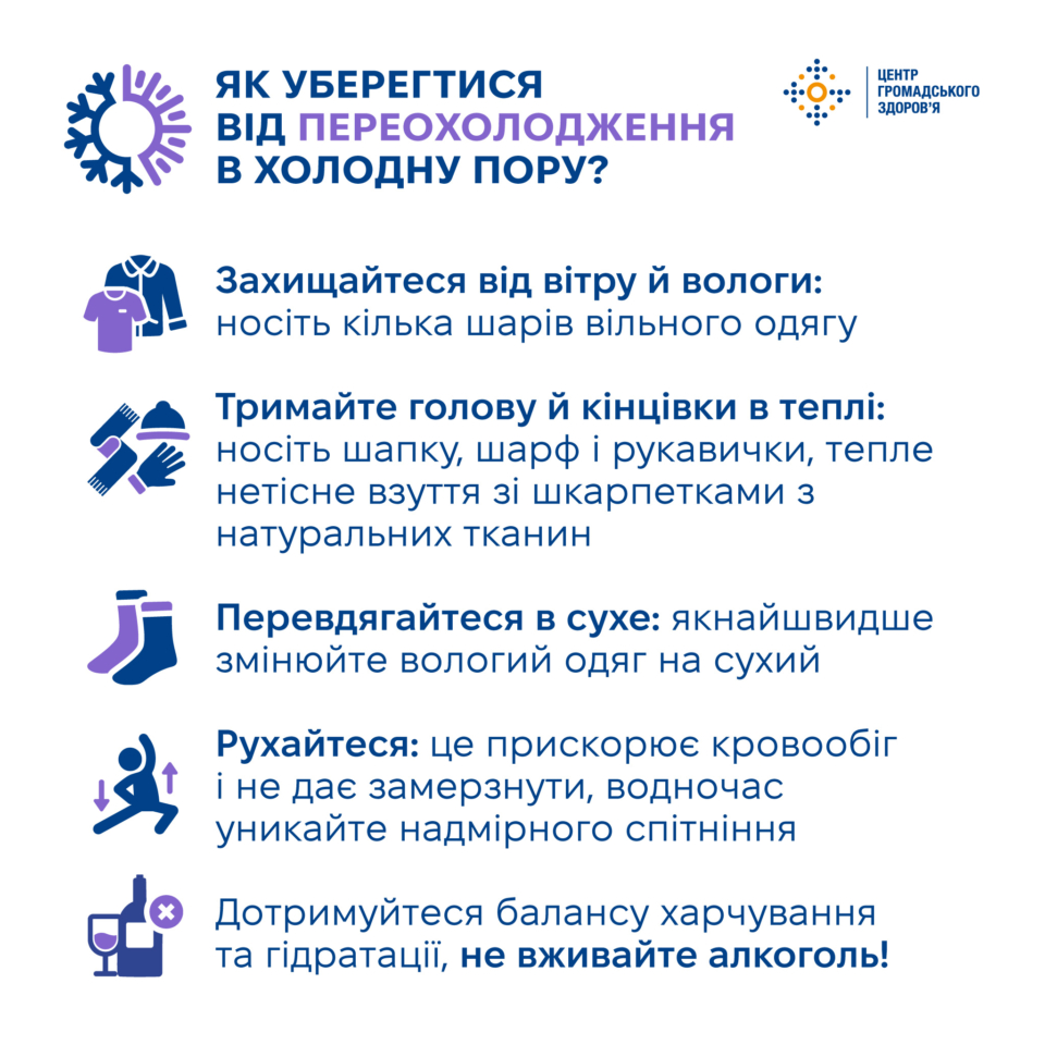 – рухайтеся: це прискорює кровообіг і не дає замерзнути, водночас уникайте надмірного спітніння;