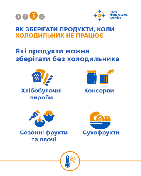 Зробіть запас харчових продуктів, що не потребують особливих умов зберігання (хлібобулочні вироби, консерви, сезонні фрукти та овочі, сухофрукти тощо). Віддавайте перевагу продуктам з малим вмістом солі та цукру: солі має бути менше ніж 1 г, а цукру менше ніж 10 г на 100 г продукту.