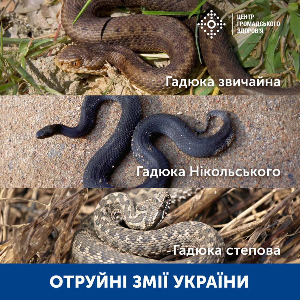 На території України мешкають декілька видів отруйних змій, через чиї укуси люди зазвичай звертаються по допомогу: